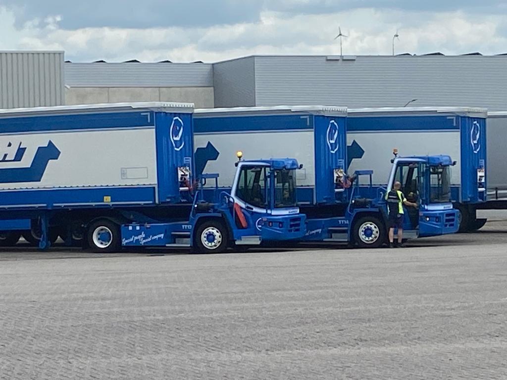 in drie ploegen. We starten op maandagochtend en eindigen zaterdagmiddag. De trekkers worden zeer intensief gebruikt. Naast de twee DT's hebben we ook drie YT's en een Terberg Body Carrier.